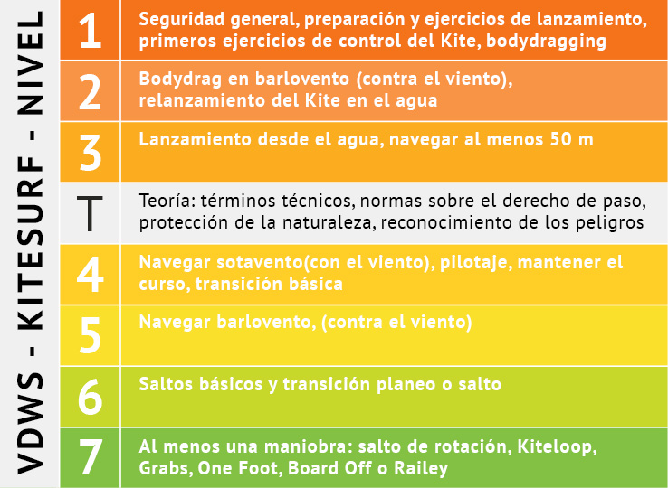 La formation pour les enfants commence par 3 heures de cours de base normal avec une petite partie théorique, un spot check, le montage et le démontage du kite, le système de sécurité en 3 étapes et le pilotage du kite d'entraînement. Pour des raisons de sécurité, la suite se fait en 3 heures de cours individuels, à raison d'une heure et demie par jour.